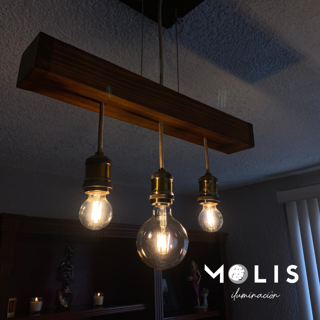 Lámpara suspendida fabricada en madera seleccionada y pulida a mano. Colgada con cable textil para un efecto luminoso suave y flotante. Cable ajustable de hasta 1.5 m y 3 focos LED incluidos.